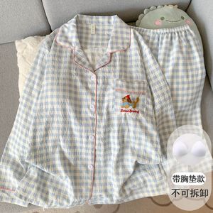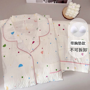 带胸垫纯棉纱布睡衣女长袖长裤春秋款套装可爱小狗开衫家居服夏季