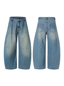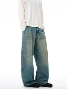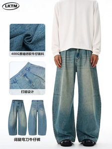 LKTM男装 美式复古怀旧蓝打褶弯刀牛仔裤男女cleanfit慵懒拖地裤