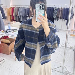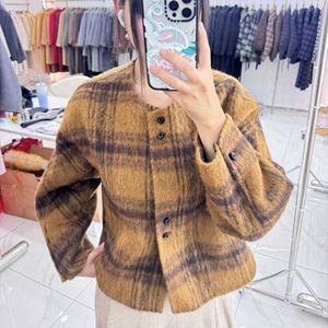 2025韩版新款苏力羊驼毛格子羊绒外套短款宽松小香风圆领毛呢外套