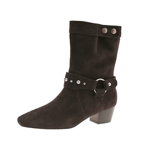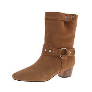 复古中筒西部牛仔靴女2025秋冬新款铆钉尖头牛皮堆堆靴粗跟瘦瘦靴