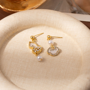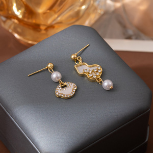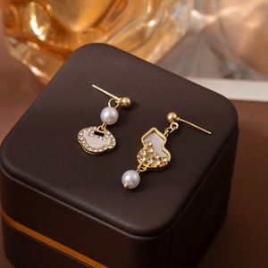 银针新中式国潮时尚超仙贝母珍珠耳钉不对称精致葫芦平安锁耳环